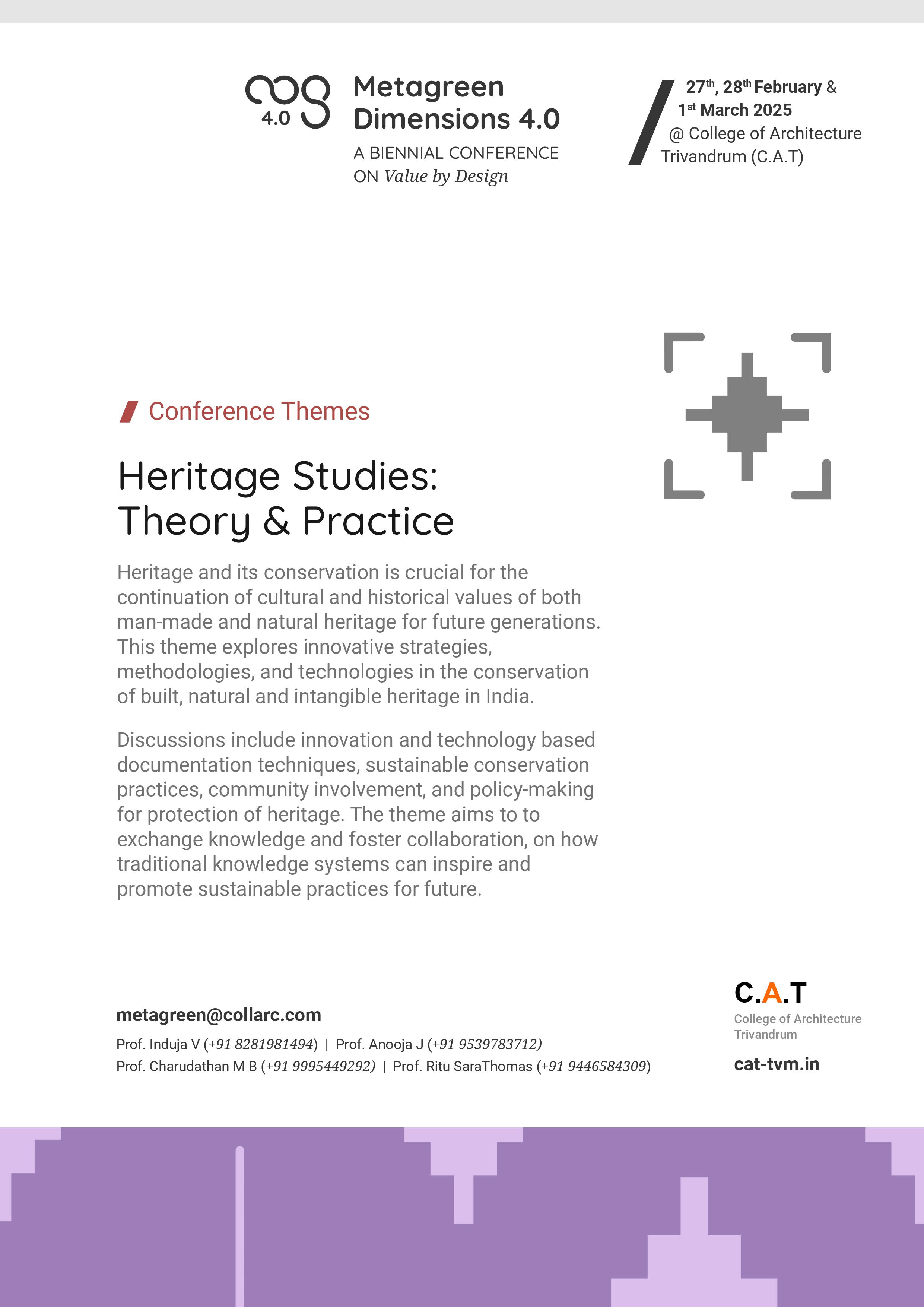 Heritage and its conservation is crucial for the continuation of cultural and historical values of both man-made and natural heritage for future generations. This theme explores innovative strategies, methodologies, and technologies in the conservation of built, natural and intangible heritage in India.