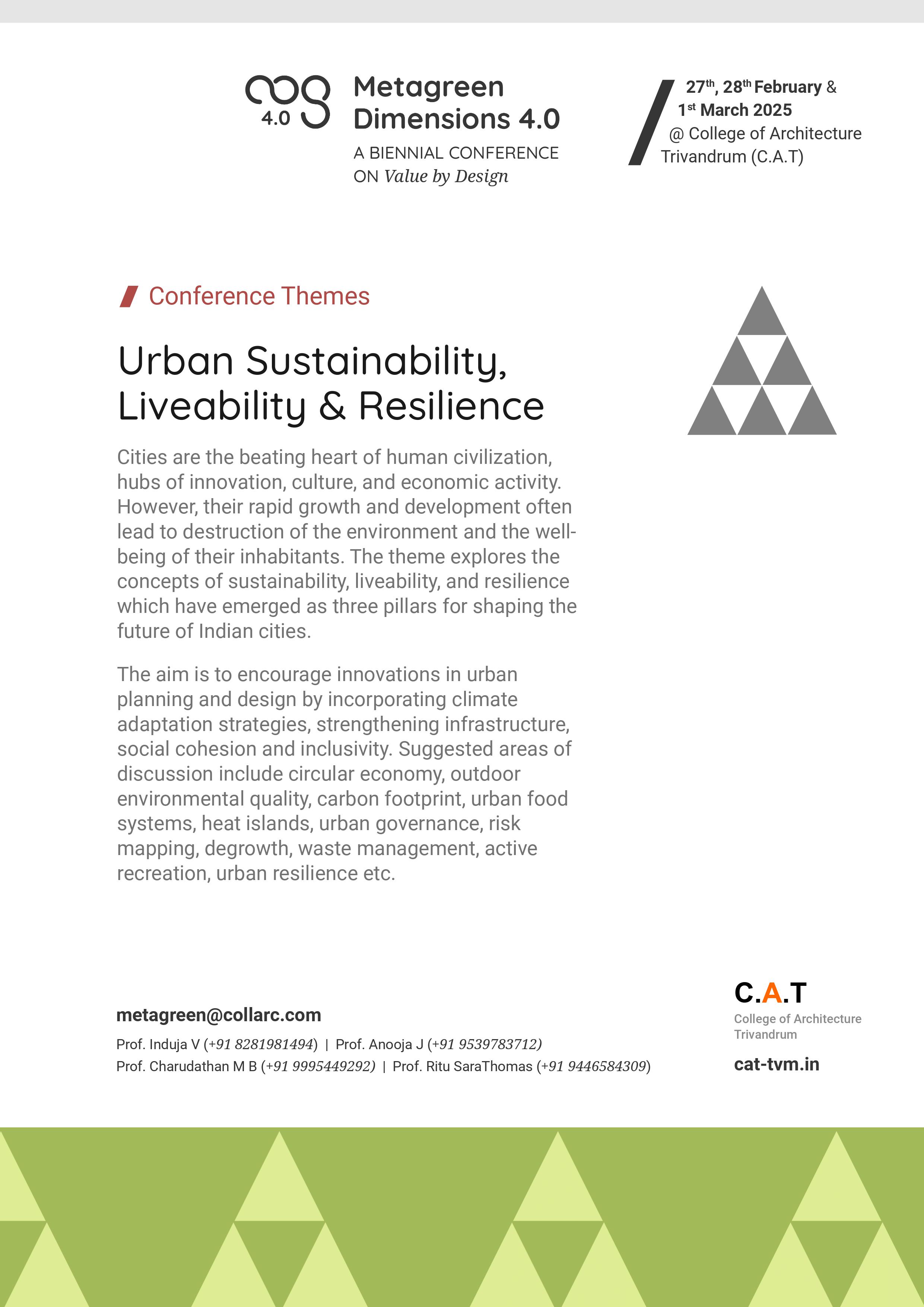 Cities are the beating heart of human civilization, hubs of innovation, culture, and economic activity. However, their rapid growth and development often lead to destruction of the environment and the well-being of their inhabitants. The theme explores the concepts of sustainability, liveability, and resilience which have emerged as three pillars for shaping the future of cities.